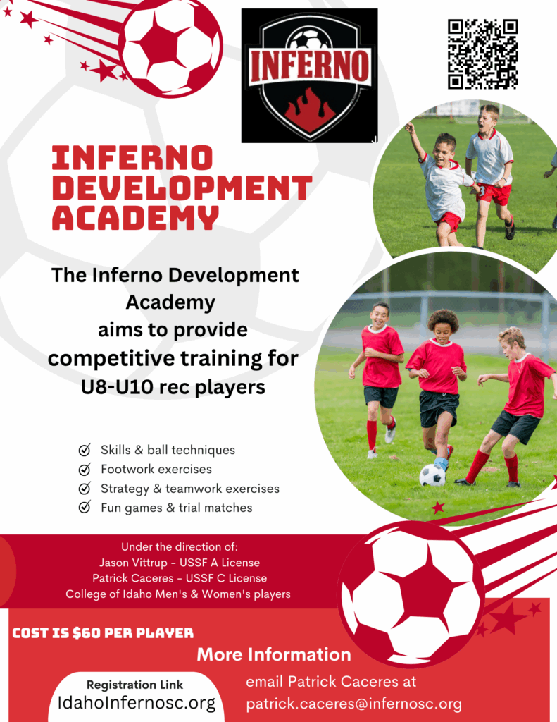 U8/U9 is the starting age for competitive play in the state of Idaho. The transition from recreational to competitive mind sets related to training and play can be challenging. The Inferno Development Academy (IDA) is designed to make this transition more simple for those interested in following the competitive path in Soccer. The Inferno Development Academy offers high-level, competitive-style training for U8-U10 recreational players. Our program is designed to elevate young athletes’ skills, fostering growth and confidence in a fun and challenging environment. This is the perfect opportunity for players looking to take their game to the next level!